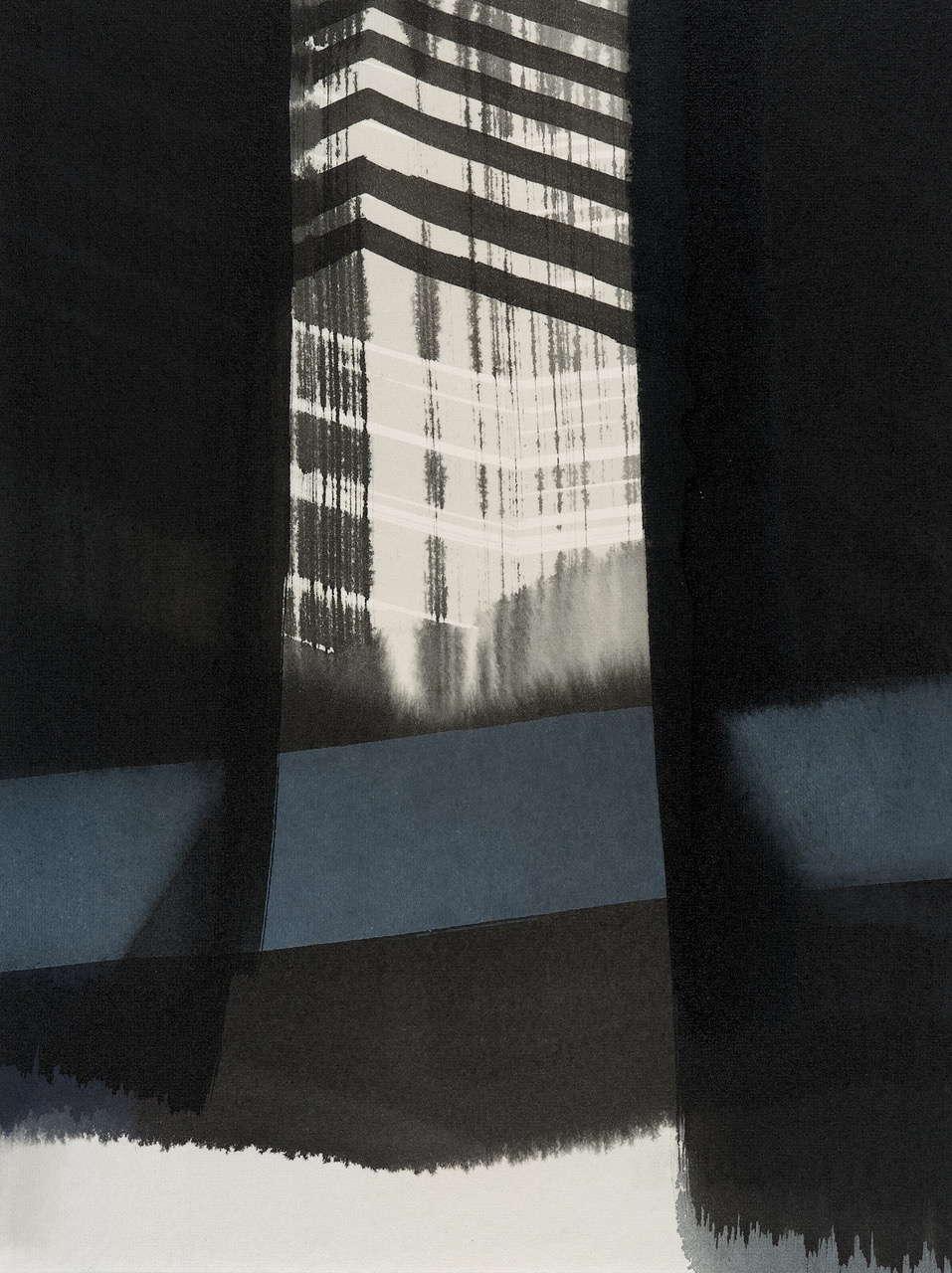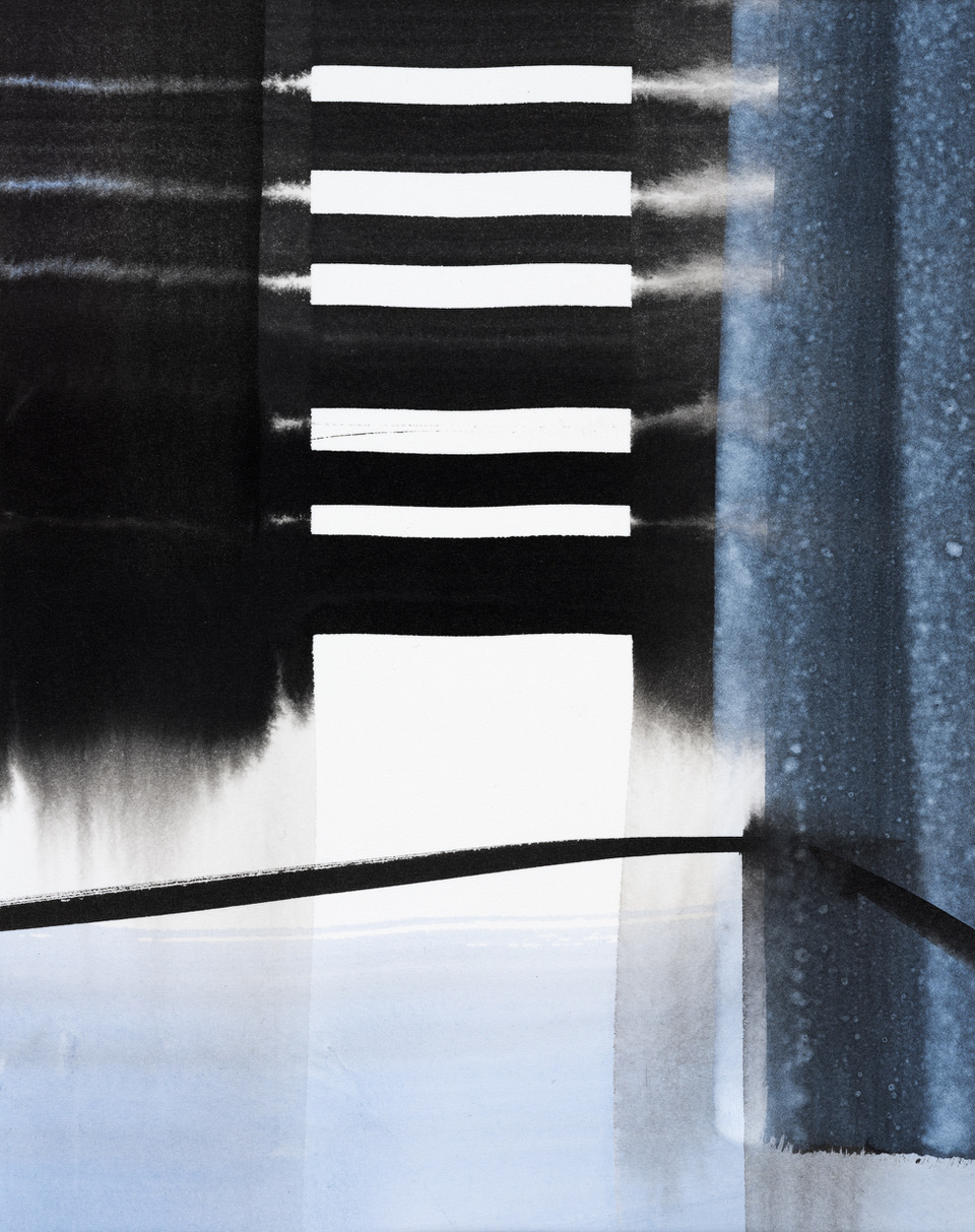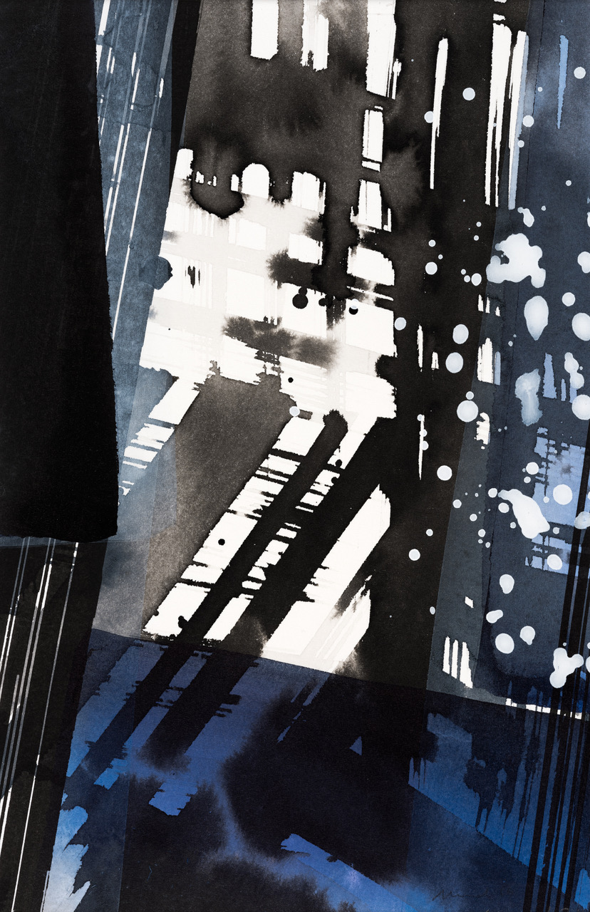Esther Nauseds Arbeiten auf Papier sind Konstruktion und freier prozesshafter Entwurf zugleich. Grundthema ist der Raum, die Bildtiefe. Es entstehen keine konkreten Räume, Esther Nauseds Arbeiten bleiben ungegenständlich. Was stimmig ist, wird in einem Prozess kontrollierter Variation entdeckt. Immer wieder sucht Esther Naused Anderes, will bei jedem Bild von neuem überrascht werden. Ohne eine konkrete Vorstellung beginnt sie mit dem intuitiven Auftrag von wässrigen, waagerechten und senkrechten Bahnen auf das Papier und schafft damit die formalen Voraussetzungen zur Entstehung von Räumlichkeit. In einem zweiten Schritt arbeitet Naused mit Tusche oder Acrylfarben in diese wässrigen Bahnen hinein. Es entstehen Durchblicke, Spiegelungen, Horizonte, fließende Oberflächen oder feste Strukturen. Mal sind es dynamische Formationen, mal stille, fast sanfte Kompositionen. Immer spielt das Licht eine entscheidende Rolle.